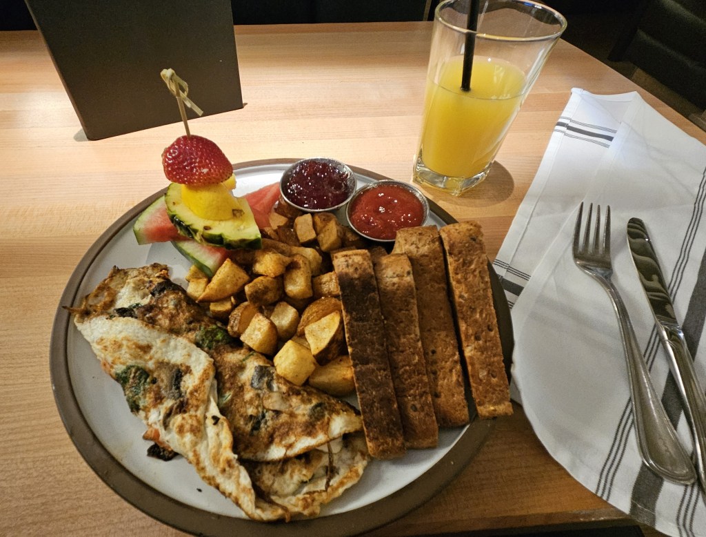 Heute früh ging mein Tag gegen 8:00 Uhr los. Ich habe den Schlaf im großen 1,60 m Bett mit richtiger Matratze genossen. Zum Frühstück bin ich wieder in das Hotelrestaurant gegangen. Für mich gab es Omelette mit Pilzen, „Frühstückskartoffeln“, was im Prinzip einfach Pommes in Würfelform waren, etwas Obst und Toastbrot mit Marmelade.