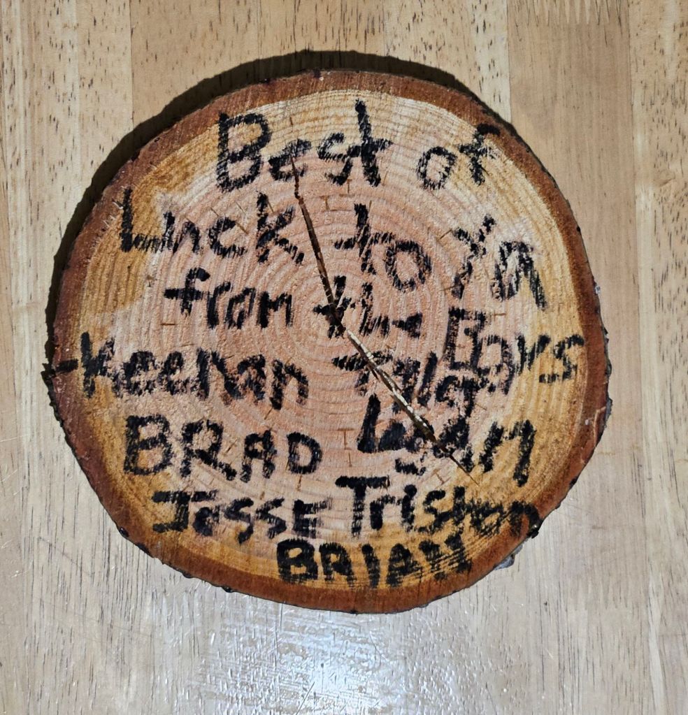 An meinem letzten Arbeitstag habe ich dann für alle Donut-Löcher gekauft. Kleine Kugeln aus Donut-Teig. Zum Feierabend gab es dann noch Bier, wir haben uns noch etwas unterhalten und dann verabschiedet. Für mich gabs als Erinnerung noch diese Holzscheibe.