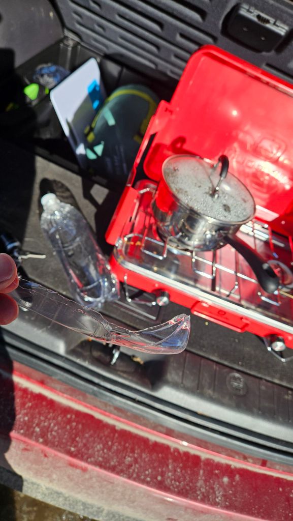 Vom Schnee her war der Tag wie ein sonniger Tag in den Alpen. Am Morgen eine harte, aber gut präparierte Piste, über den Vormittag wurde es dann immer eisiger und am Nachmittag war der Schnee nur noch Sulze. Ich hatte dennoch meinen Spaß und unterhielt mich im Sessellift noch mit einem Kanadier, der für nächstes Jahr eine Europareise in die Alpen geplant hatte. Zum Mittag hab ich mir dann noch mein Chili sin Carne im Kofferraum meines Autos aufgewärmt und hatte so ein gutes und warmes Mittagessen, ohne mir die überteuerten Preise im Skigebiet gefallen lassen zu müssen. Leider habe ich mein Geschirr vergessen. Deshalb habe ich mir aus einer Plastikflasche einen Löffel gebastelt und aus dem Topf gegessen. Abenteuer pur.