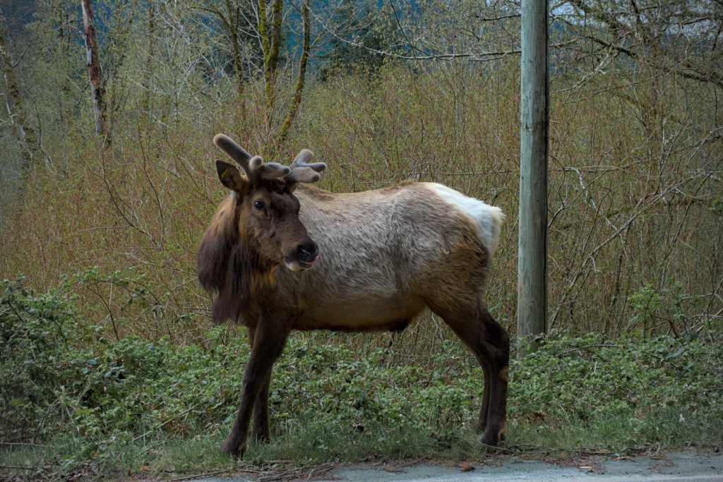 Nach einer recht kühlen Nacht um den Gefrierpunkt machten wir uns auf zu einem nahegelegenen See. Dort wanderten wir 3h auf einem Berg, der als Halbinsel im See lag. Leider fing es am Gipfel an zu schneien, hageln und regnen … Glücklicherweise waren es immer nur kurze, leichte Schauer. Nachdem wir am Auto waren, fing es dann nach einigen Minuten Sonne plötzlich wieder an, stark zu regnen. Richtiges Aprilwetter eben. Auf der Suche nach einem geeigneten bzw. geschützten Platz für unser Vesper sind wir plötzlich auf einen Hirsch gestoßen. Wenige Minuten später auf eine ganze Herde.