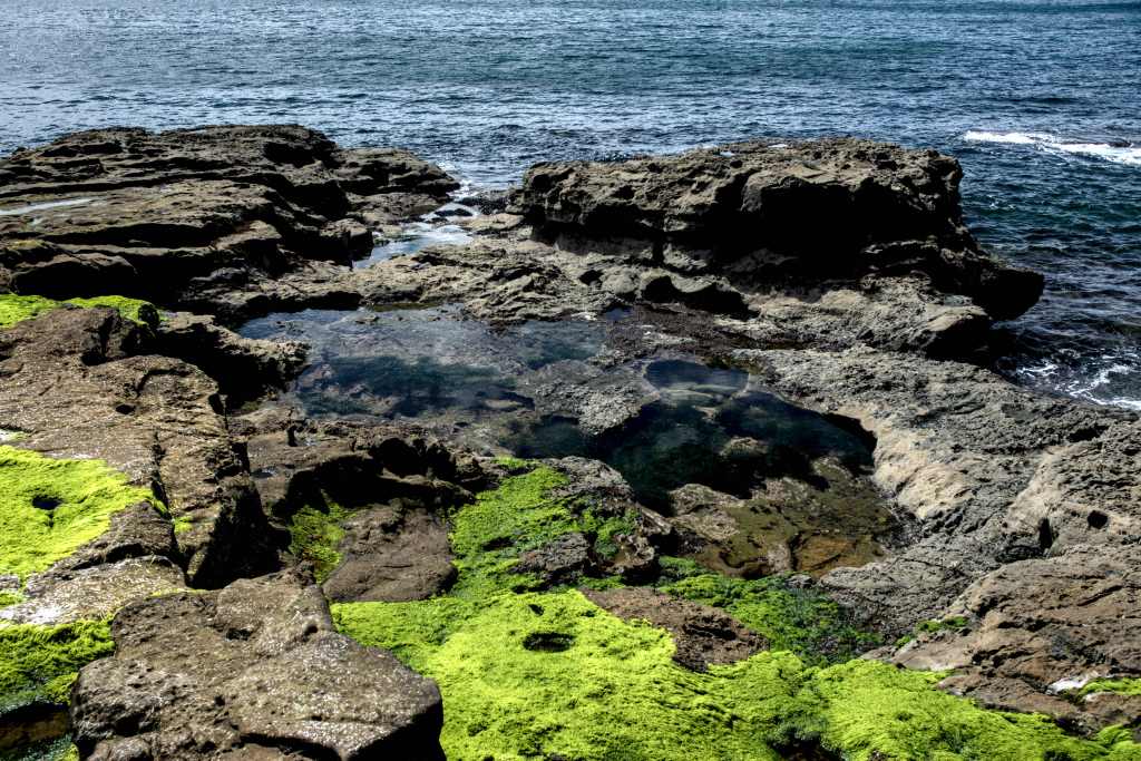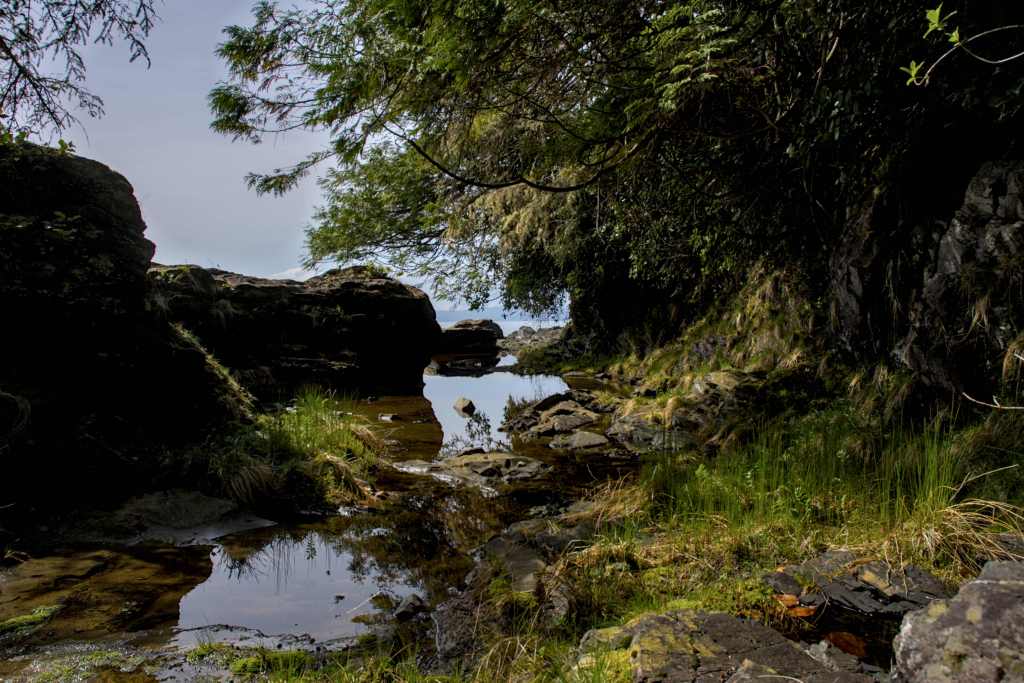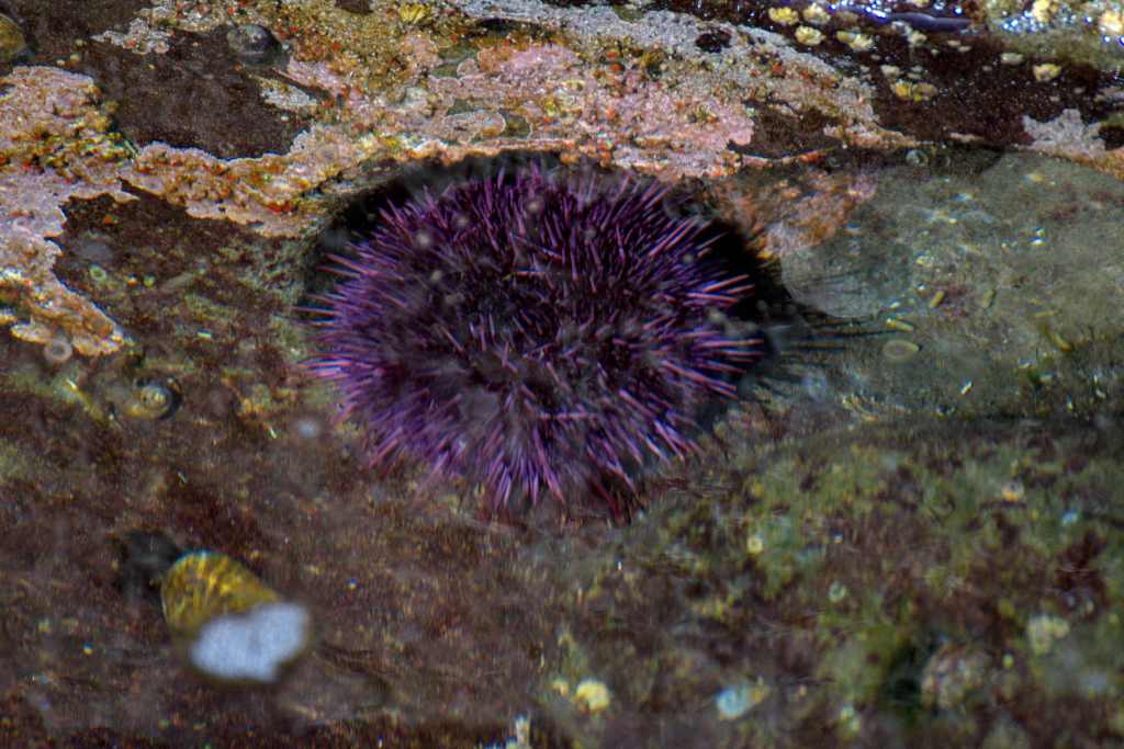 In den Becken, welche während der Ebbe zum Meer abgeschieden waren, entdeckten wir dann noch lila Seeigel. Am Parkplatz wartete dann zu guter Letzt noch ein tropisch aussehender Vogel (Diademhäher).