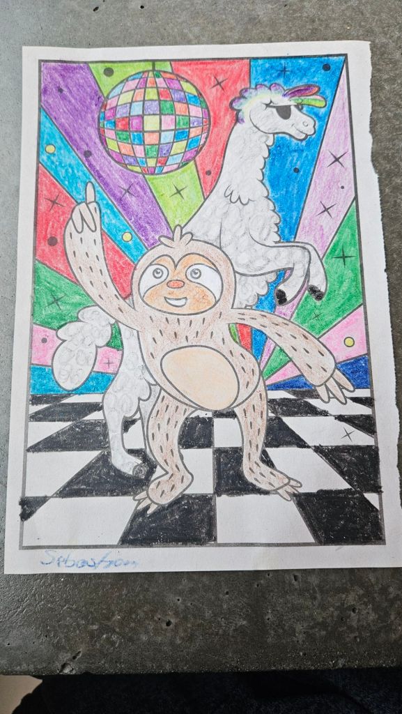 Die nächsten beiden Tage gingen wir dann etwas entspannter an. Frisbee spielen auf dem Campingplatz, Sonne tanken, Wäsche waschen, einkaufen etc. Mein Highlight war der Besuch in einer lokalen Brauerei, welche jeden Montag ein „Ausmal“ Event hat. So saßen wir mit 4 anderen erwachsenen Männern in einer Kneipe und haben Bilder ausgemalt. Hier seht ihr mein Kunstwerk: